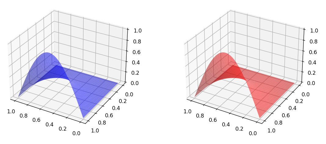 axs[1].plot_surface(xval,yval,closed_solution(xval,yval),alpha=0.5,color='red')