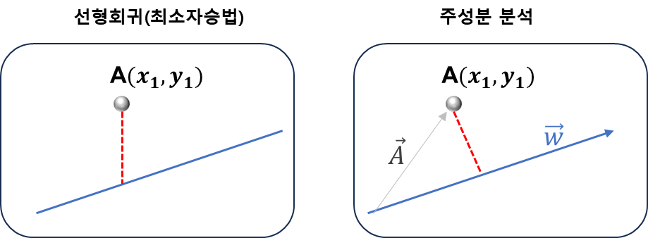 우선, 차이점은 선형회귀는 주어진 데이터를 잘 설명하는 일차 직선을 찾는 문제이고, PCA는 주어진 데이터를 잘 설명하는 벡터(주성분)를 찾는 문제입니다. 하지만,